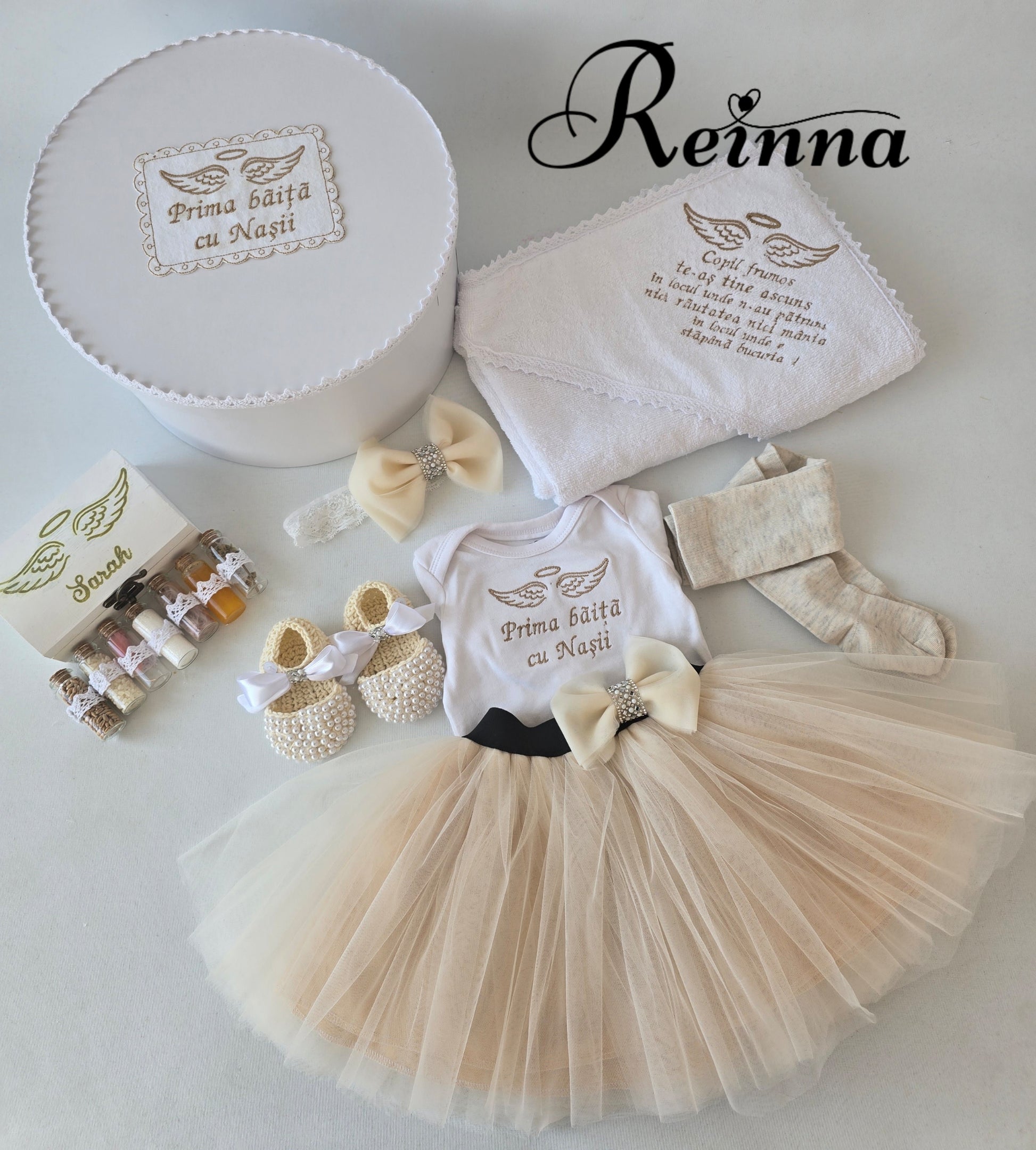 •Cufăr încăpător, personalizat Prima băița cu Nașii,  la cerere se poate personaliza gratuit cu prenume sau scurt mesaj din partea nașilor.